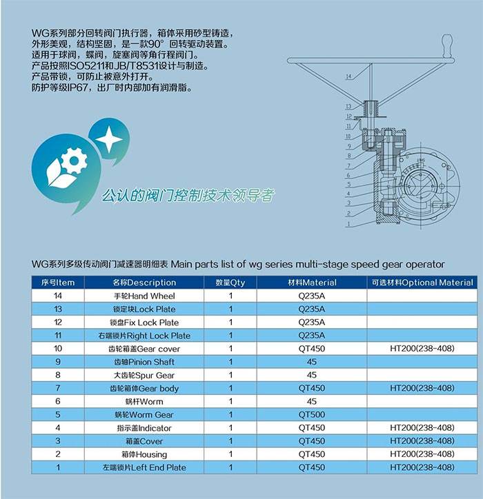 WG系列部分回轉(zhuǎn)閥門執(zhí)行器,殼體采用灰鐵或球鐵鑄造。外形美觀,結(jié)構(gòu)堅(jiān)固。適用于球閥、蝶閥、旋塞閥等角行程閥門。具有90±5°調(diào)節(jié)功能,產(chǎn)品帶鎖,可防止閥門被意外開啟,整機(jī)可達(dá)IP65密封。